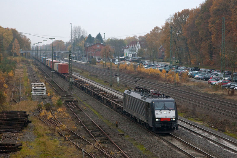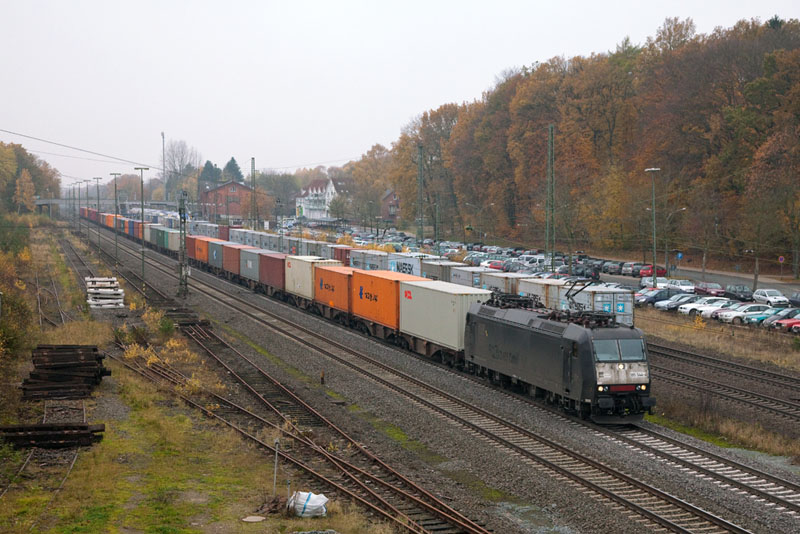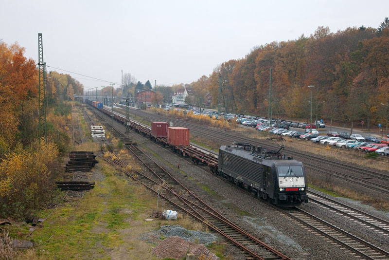 | Die ES 64 F4-157 der MRCE mit einem boxXpress.de-Containerzug nach Hamburg. Tostedt, 9. November 2012 |