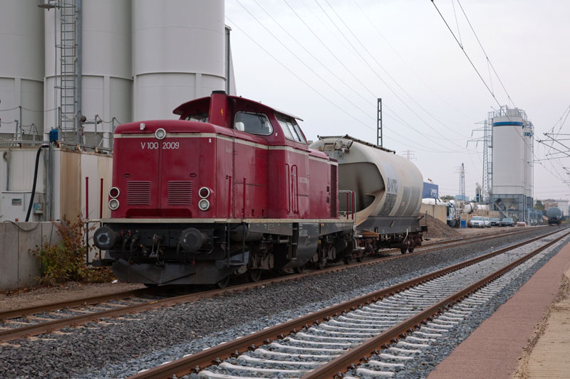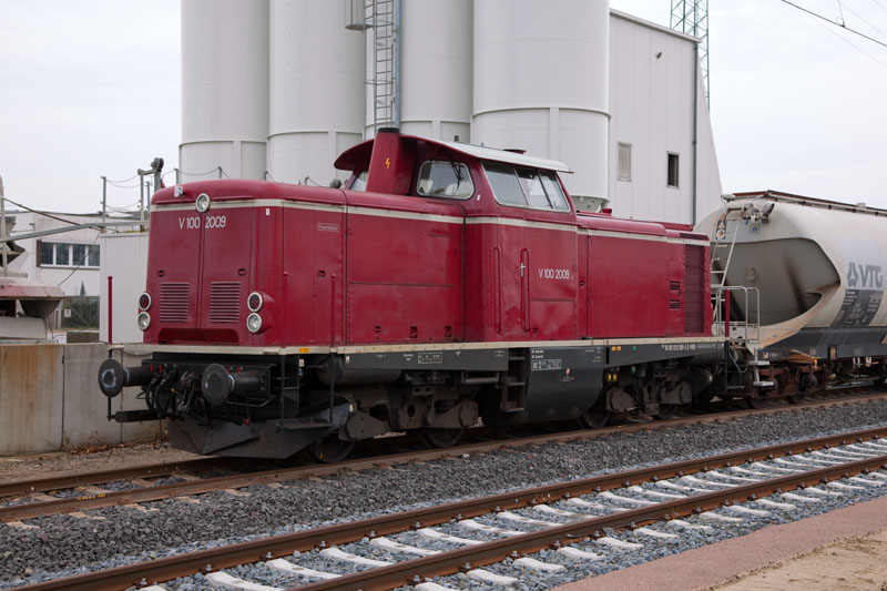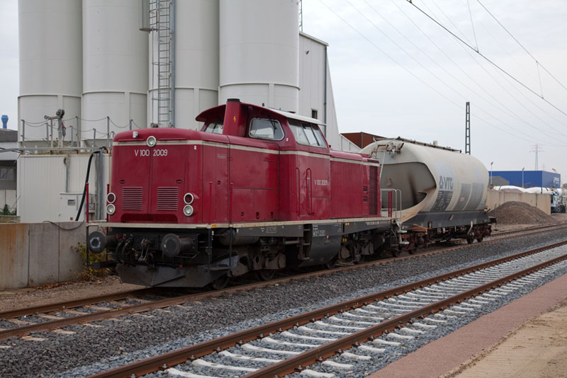 | Nanu, eine Lok der Hafenbahn Neustrelitz in Hamburg! Die altrote V 100 2009 am Ladegleis der Beton-Industrie. Hamburg-Hohe Schaar, 10. November 2012 |