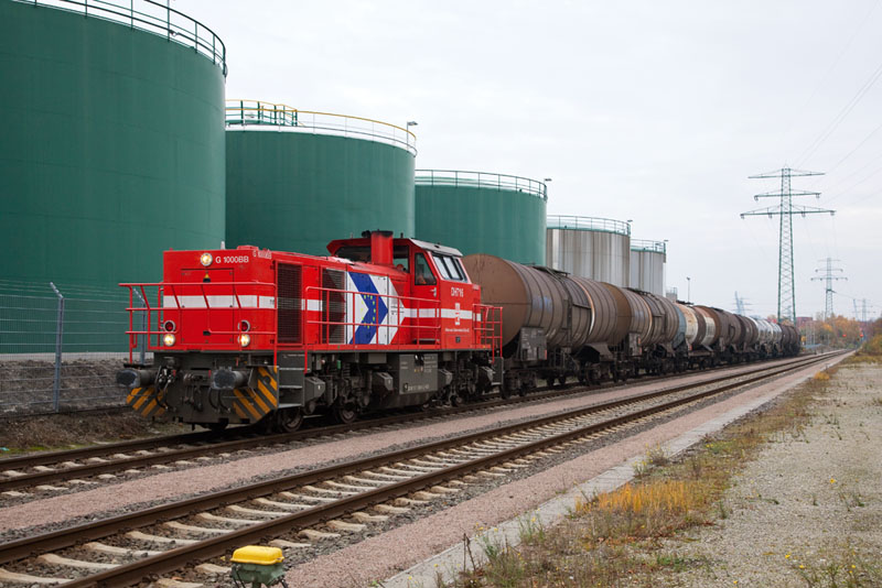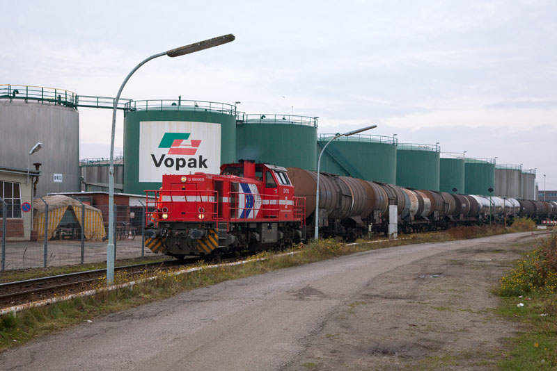 | Die DH 716 der HGK kam mit Kesselwagen aus dem Anschluss von Vopak. Hamburg-Rethe, 10. November 2012 |