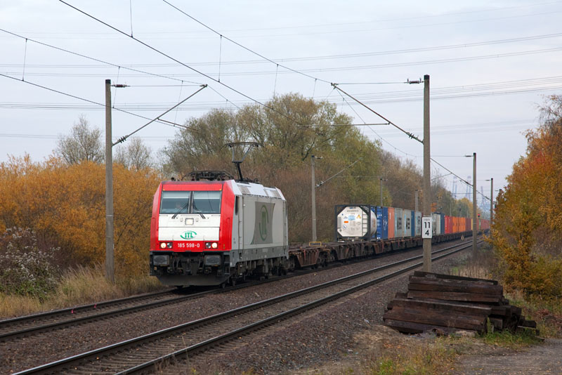 | Ein ausfahrender Containerzug mit der 185 598-0 der ITL. Hamburg-Moorburg, 10. November 2012 |