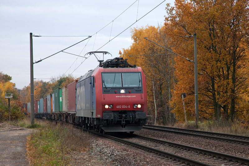 | Ebenso in den Hafen fuhr dieser Containerzug mit der 482 034-6 der SBB Cargo. Hamburg-Moorburg, 10. November 2012 |