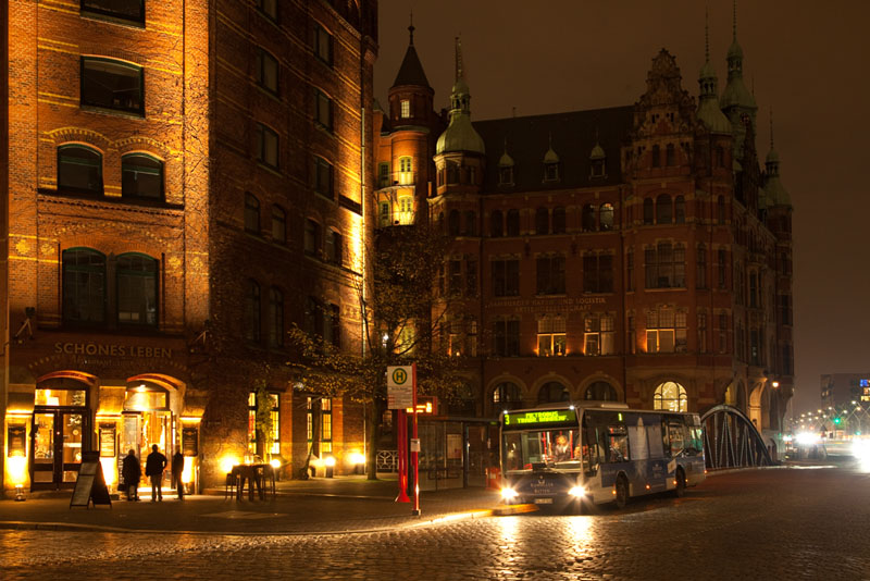 | An der Bushaltestelle "Bei St. Annen" der Metrobuslinie 3 – hinten ist die HHLA-Hauptverwaltung. Hamburg-Speicherstadt, 10. November 2012 |