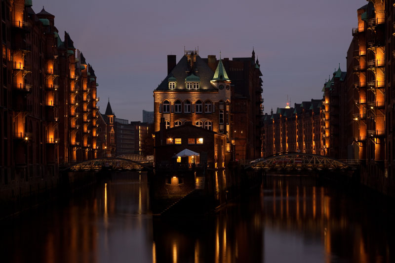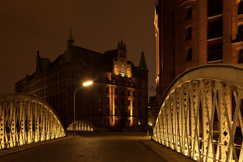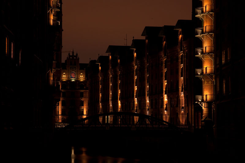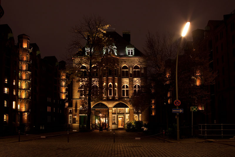 | Abends ist die Hamburger Speicherstadt wunderschön mit ihrer Beleuchtung. Hamburg-Speicherstadt, 10. November 2012 |