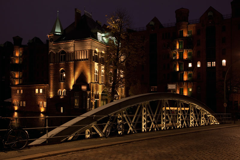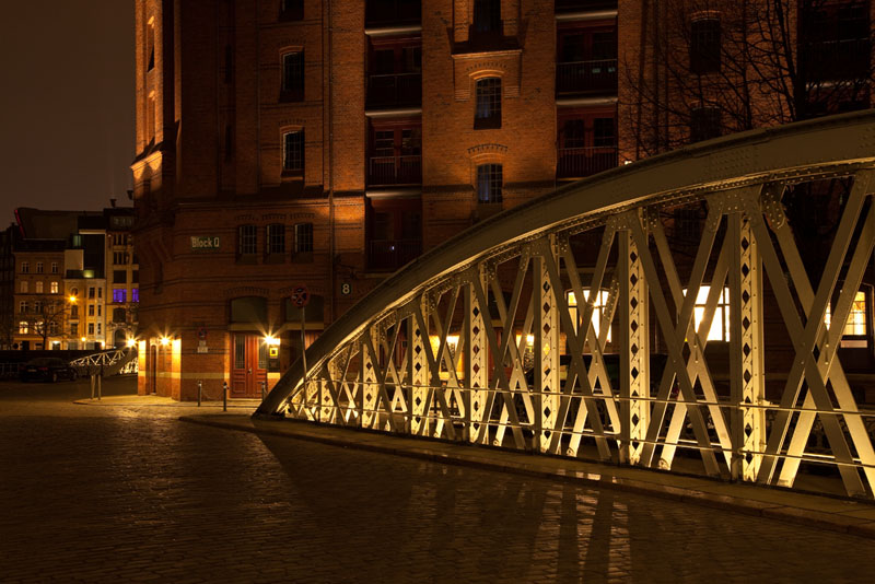 | Die Neuerwegsbrücke und der Block Q. Hamburg-Speicherstadt, 10. November 2012 |