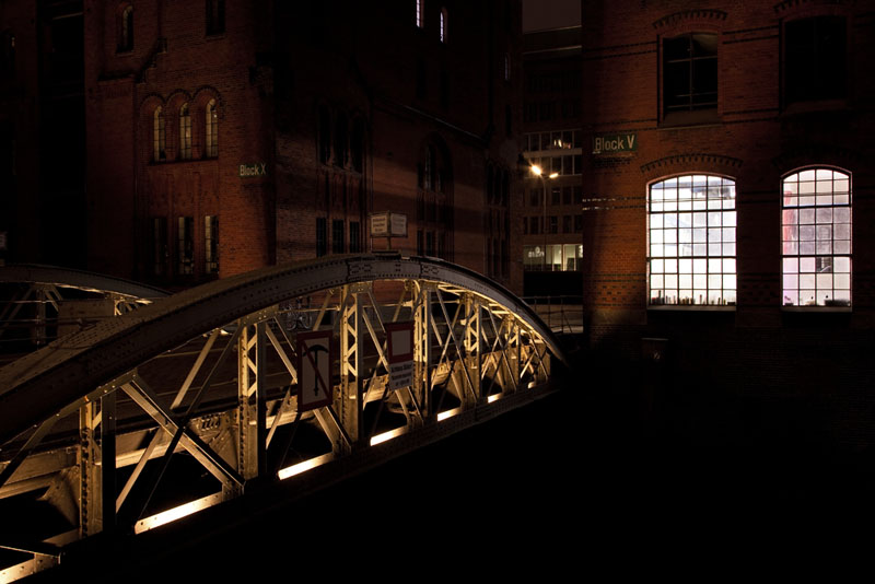 | Die Holländisch-Brookfleet-Brücke und der Block V. Hamburg-Speicherstadt, 10. November 2012 |