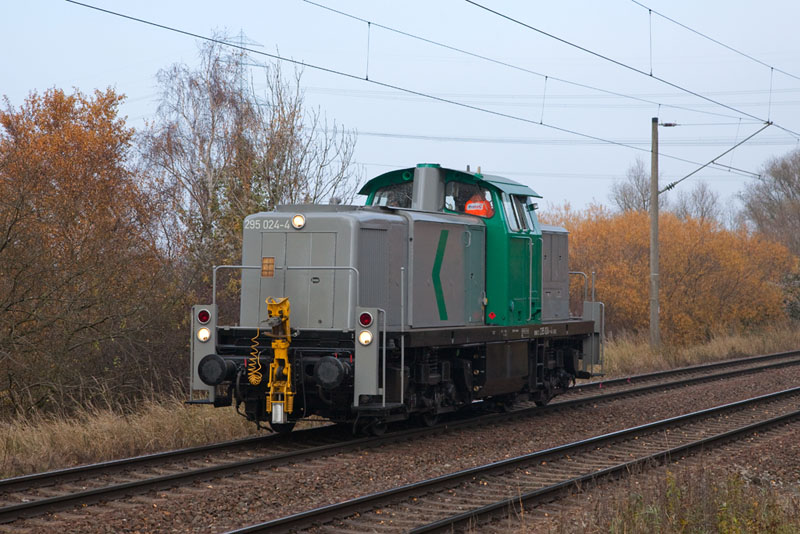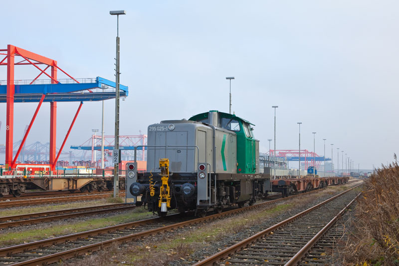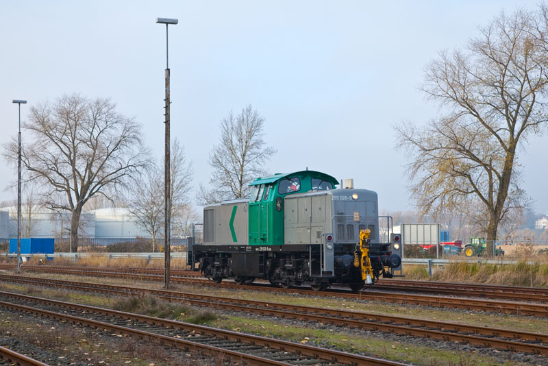 | Aus dem Hafen heraus fuhr die ehemalige DB-Lok 295 024-4 der B&V Leipzig im Einsatz für die ABEG. Hamburg-Moorburg, 17. November 2012 |