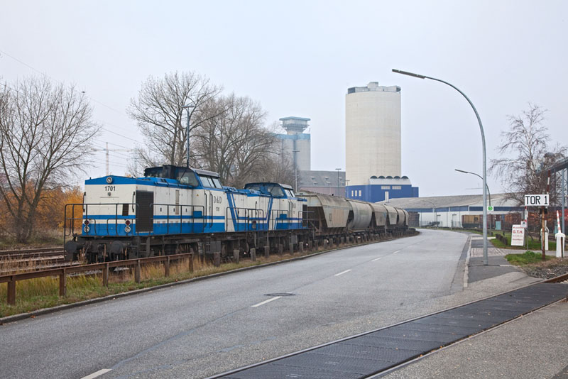 | Auf der Ostseite des Hafenbahnhofes standen die beiden D&D-Loks 1701 und 1702 vor einem Cerealienzug abgestellt. Hamburg-Hohe Schaar, 17. November 2012 |