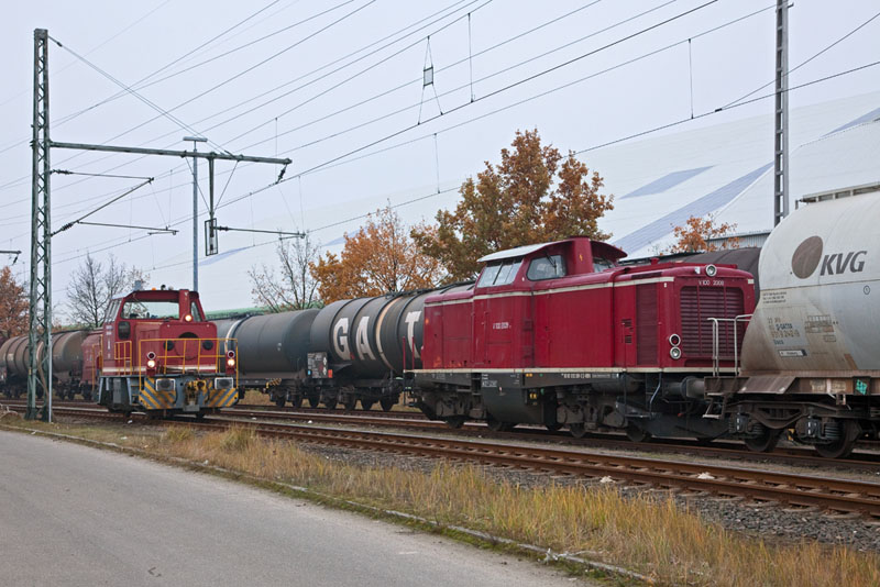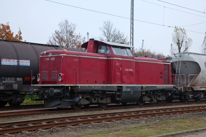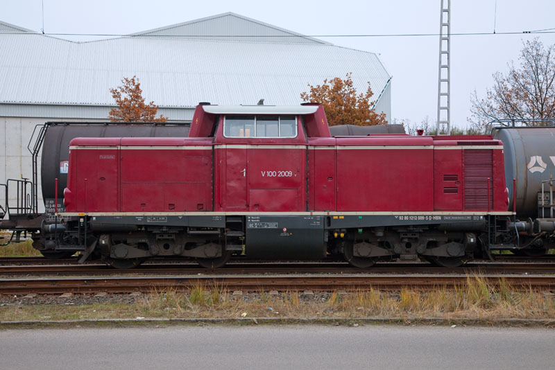 | Die altrote V 100 2009 der Hafenbahn Neustrelitz. Hamburg-Hohe Schaar, 17. November 2012 |