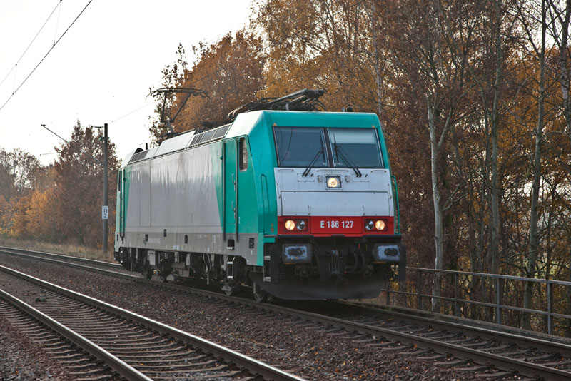 | In den Hafen fuhr die E 186 127 der ITL herein. Hamburg-Moorburg, 17. November 2012 |