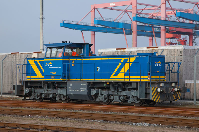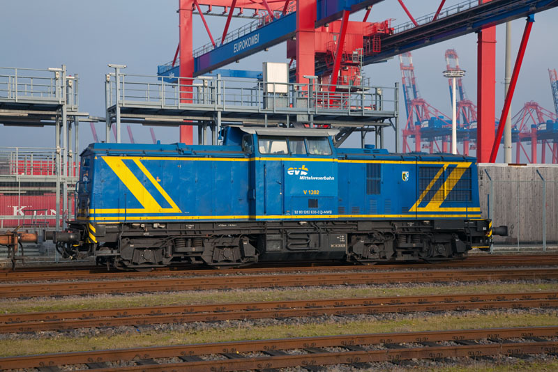 | An den Führerhauswänden der V 1202 steht genau "evb Mittelweserbahn". Hamburg-Waltershof, 17. November 2012 |