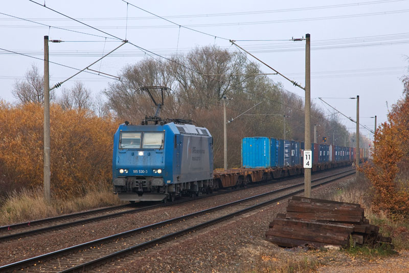 | Die langjährige VPS-Lok 185 530-3 mit einem Containerzug aus dem Hafen. Hamburg-Moorburg, 17. November 2012 |