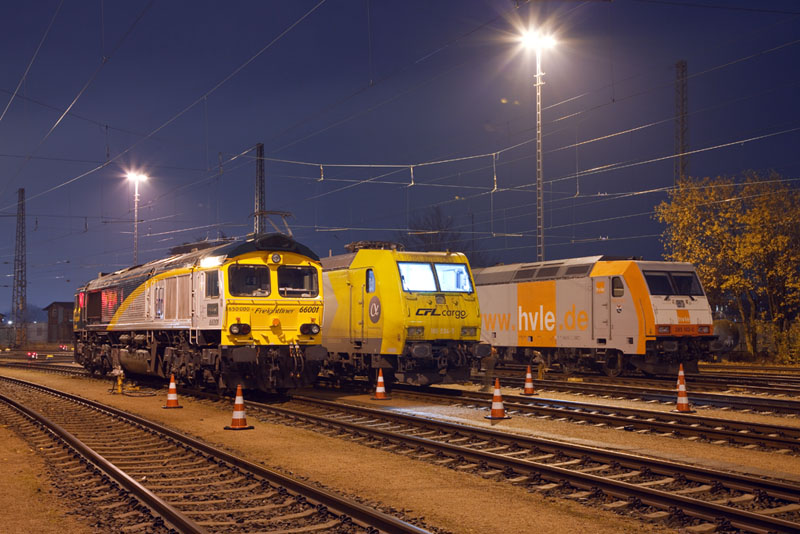 | Freightliner Polska 66001 "Willy Brandt" vor 185 534-5 der CFL Cargo und 285 102-2 der HVLE. Hamburg-Veddel, 23. November 2012 |