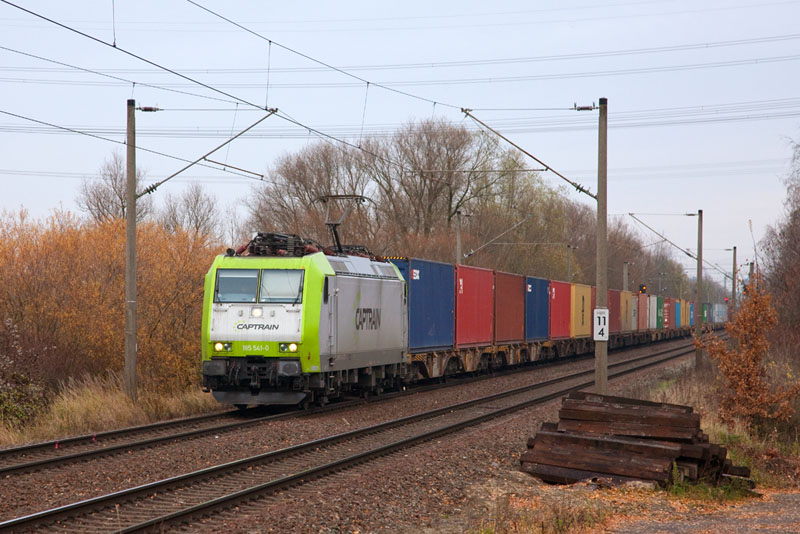 | Dagegen fuhr die 185 541-0 der CAPTRAIN mit ihrem Containerzug aus dem Hafen. Hamburg-Moorburg, 23. November 2012 |