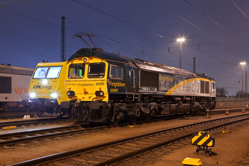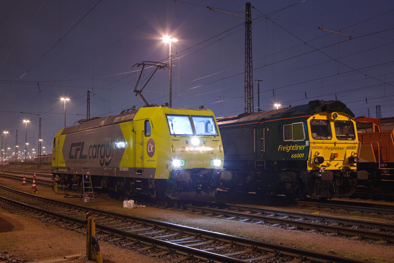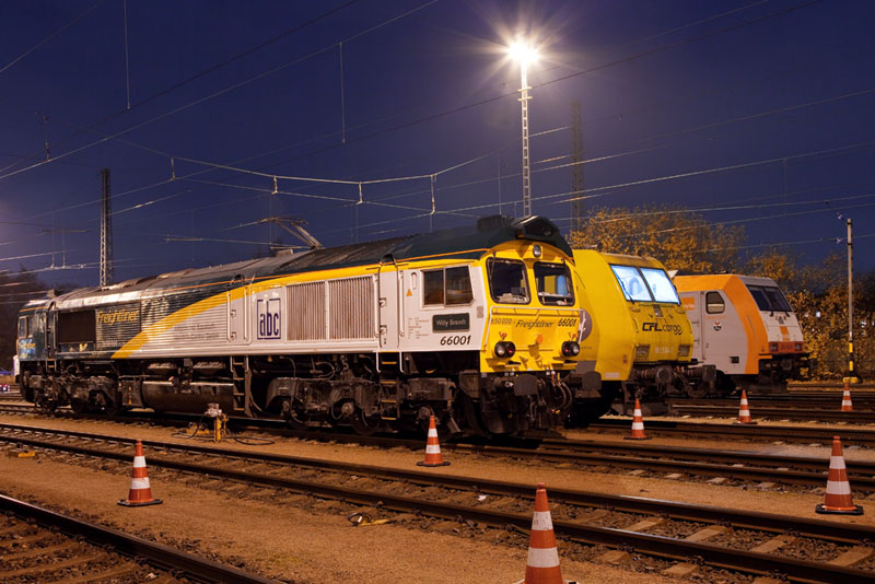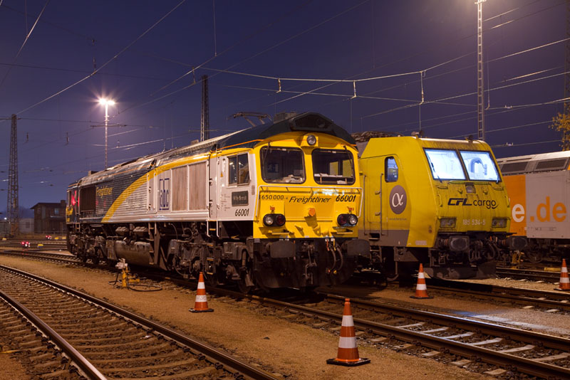 | Freightliner Polska 66001 "Willy Brandt" vor 185 534-5 der CFL Cargo. Hamburg-Veddel, 23. November 2012 |
