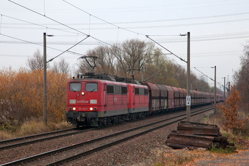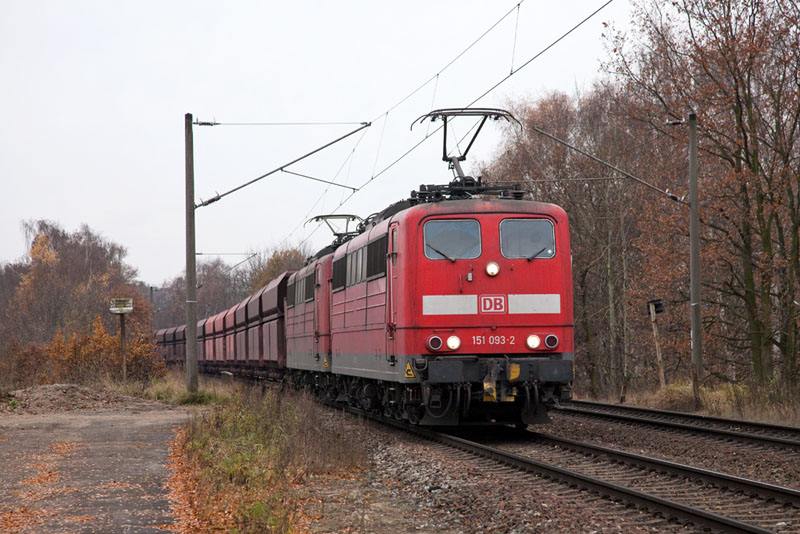 | Einen leeren Erzpark brachten 151 093-2 und 151 113-8 nach Hansaport. Hamburg-Moorburg, 23. November 2012 |