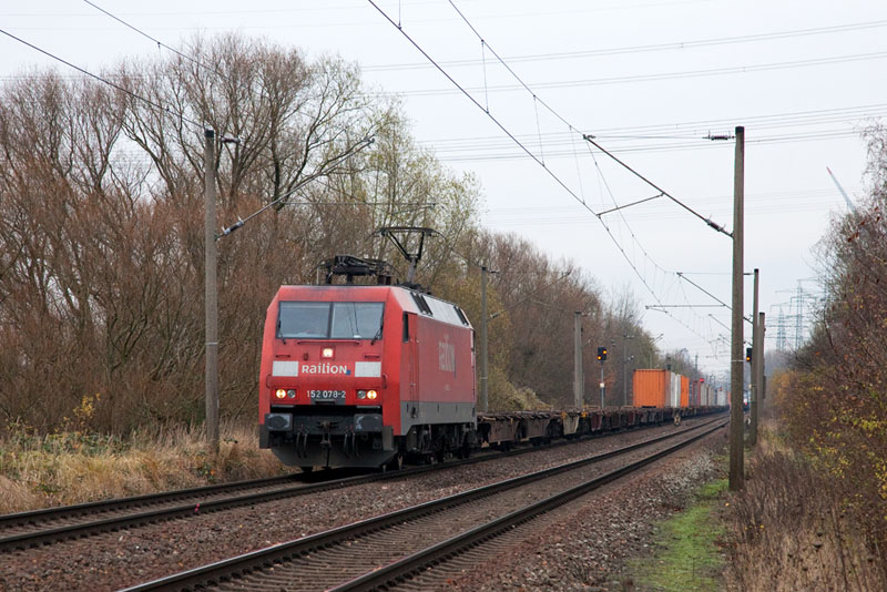 | Aus dem Hafen heraus fuhr die 152 078-2 mit ihrem Containerzug. Hamburg-Moorburg, 23. November 2012 |