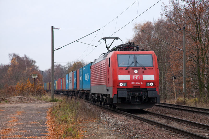 | In den Hafen herein die 189 014-4 mit ihrem Containerzug. Hamburg-Moorburg, 23. November 2012 |