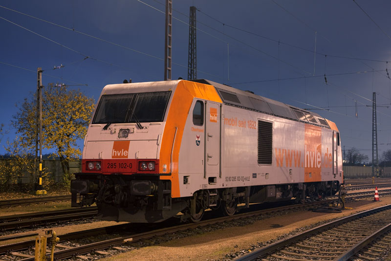| Die TRAXX-Diesellok F140DE alias 285 102-0 der Havelländischen Eisenbahn (HVLE). Hamburg-Veddel, 23. November 2012 |
