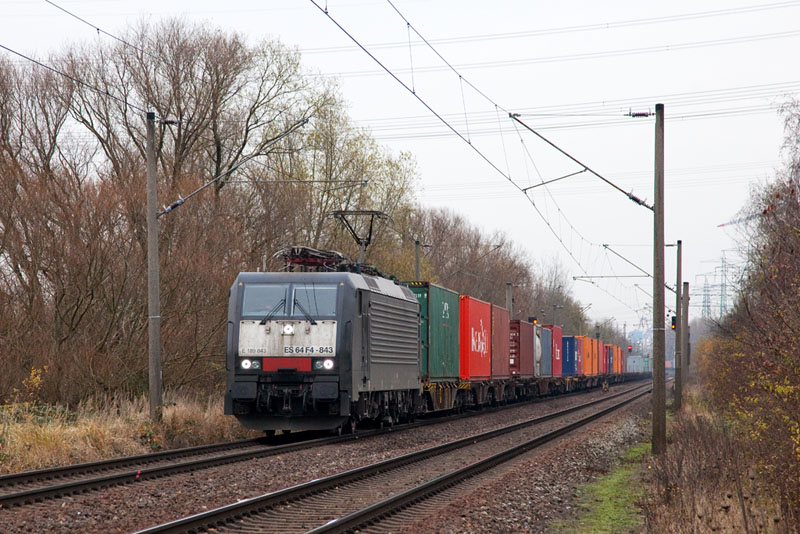 | Die für DB Schenker fahrende ES 64 F4-843 der MRCE mit einem Containerzug. Hamburg-Moorburg, 23. November 2012 |