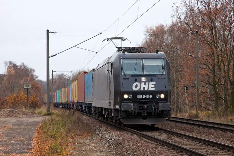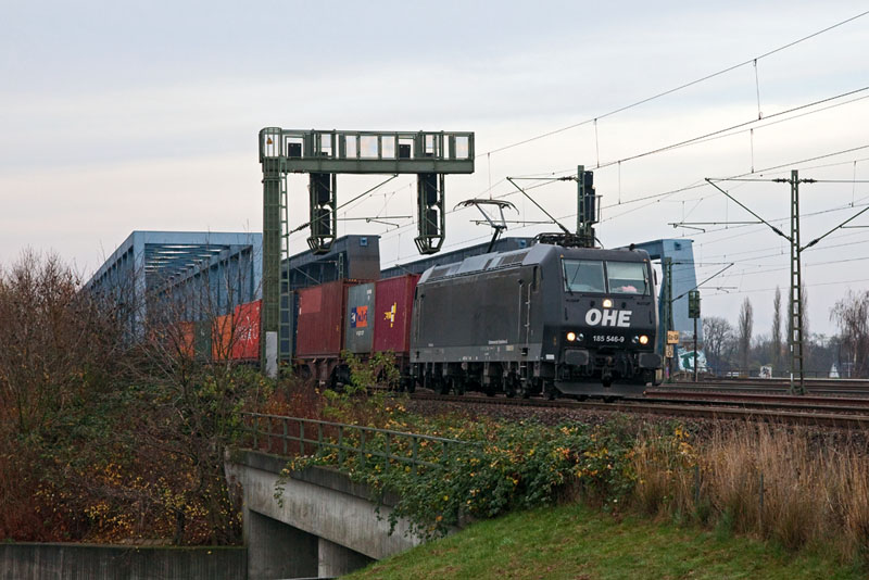 | Die OHE 185 546-9 mit einem Containerzug nach Hamburg-Harburg. Hamburg Süderelbbrücken, 23. November 2012 |