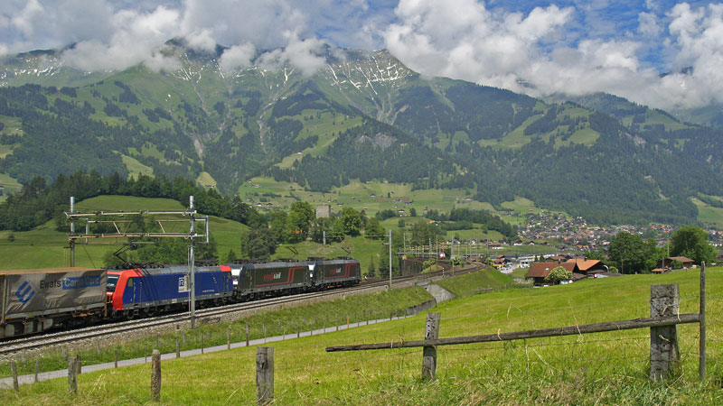 Crossrail… immer kamen diese Züge irgendwie unpassend! Diesmal war diese Dreifachtraktion schon auf dem Weg in den Norden – zwei Crossrail 185er und eine RAG-482!!!. Kandergrund | Lötschberg Nordrampe, 04. Juni 2007 | ||