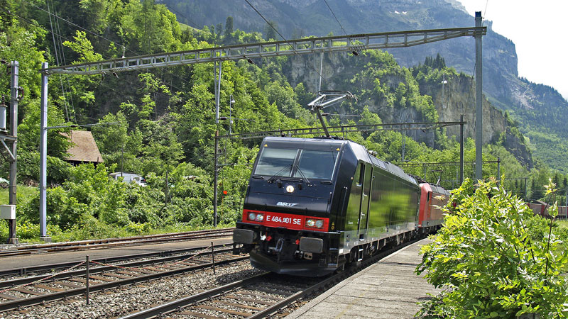 Wieder mal im falschen Moment – hier ein Notschuss auf die neue MRCE E484.901 SE und einer DB 185 auf dem Weg nach Domodossola. Blausee-Mitholz | Lötschberg Nordrampe, 05. Juni 2007 | ||