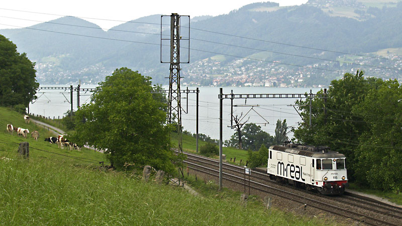 der Crossrail-Schiebeloks, die weiße 115 auf dem Weg nach Spiez. Einigen am Thuner See, 06. Juni 2007 |