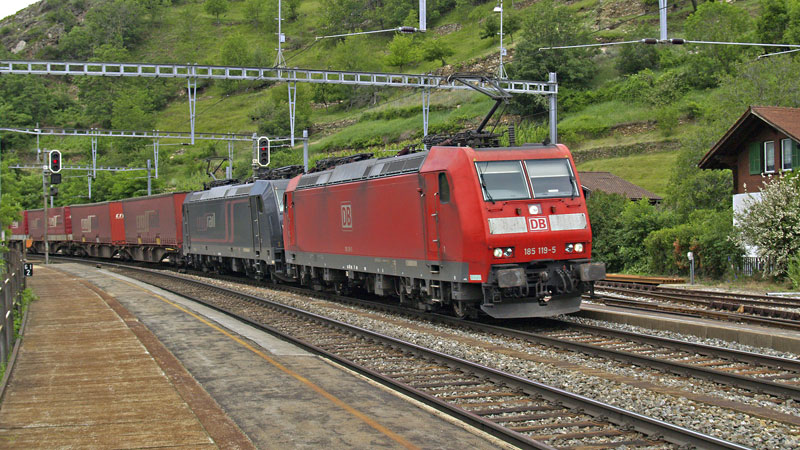 DB 185 119 und einer MRCE-Lok… Ausserberg | Lötschberg Südrampe, 07. Juni 2007 |