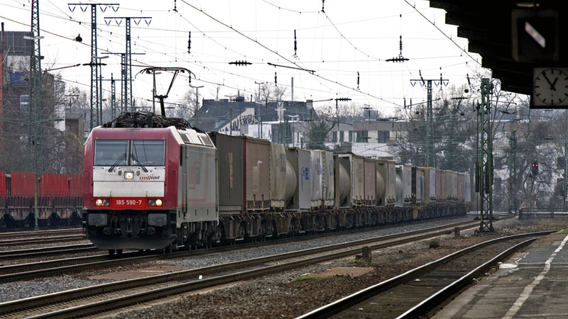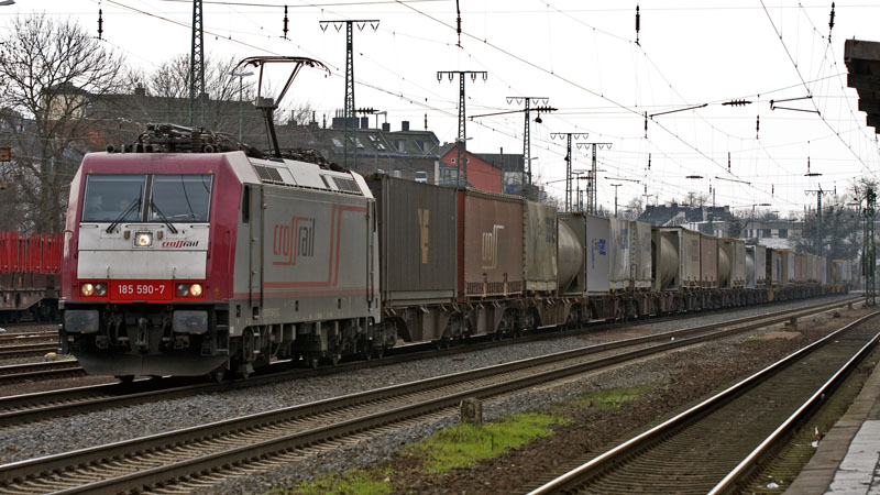 kam die 185 590-7 der schweizerischen Crossrail mit ihrem Containerzug. Köln-West, 14. März 2009 |