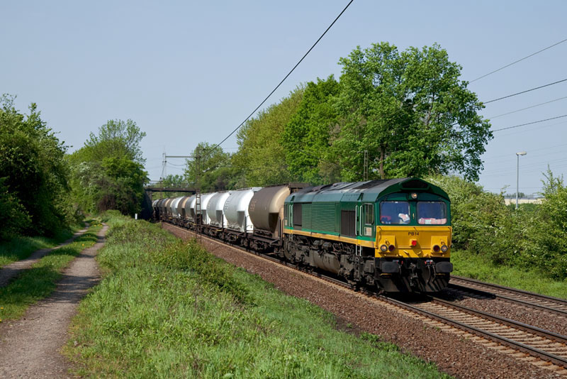 Die für CrossRail fahrende PB 14, eine Class 66, mit ihrem Staubgutzug. Ahlten, 30. April 2011 |