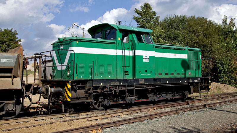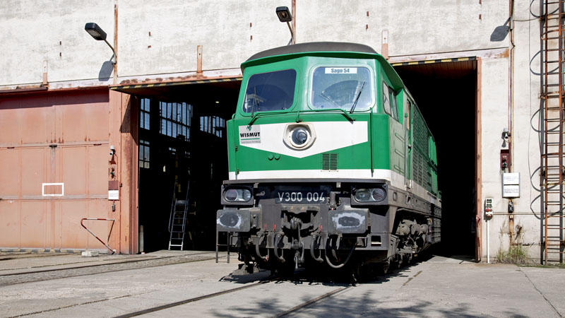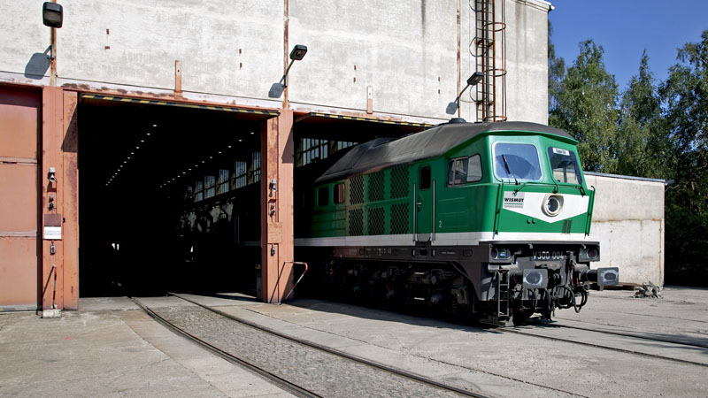 Die netten WISMUT-Mitarbeiter schoben für uns die V300 004 halb aus dem Werkstattschuppen!
