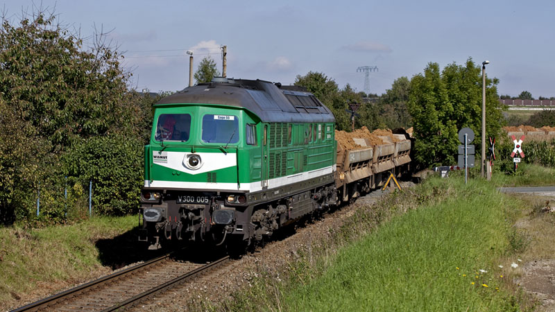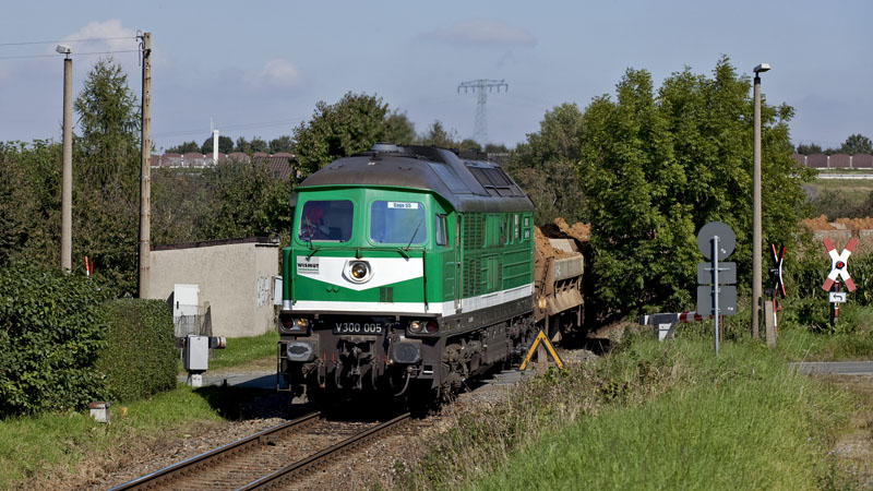 Die grüne Ludmilla! Die V300 005 brummte mit ihrem schweren Lößsandzug über diesen Bahnübergang…