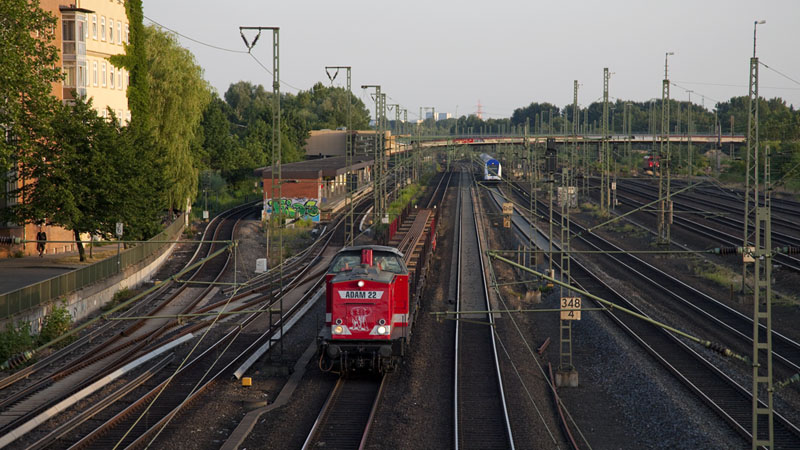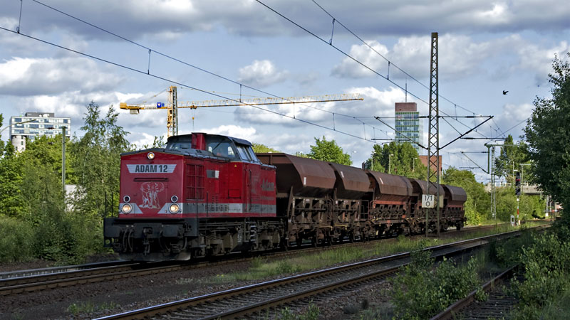 Im allerletzten Licht des Sommerabends dieselte ADAM 22 – eine V100 Ost – mit einem Schienenzug stadteinwärts.
