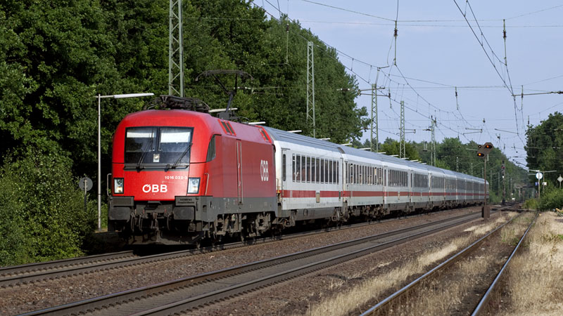 | Wenige Minuten später nach dem EN 490 kam der zweite ÖBB-Stier-Starzug – der IC 2083 Königssee. Diesmal hatte die rote 1016 018-2 die Ehre. Meckelfeld, 24. Juli 2008 | ||