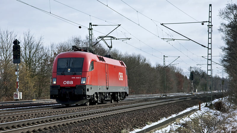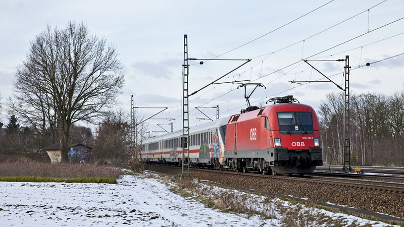 | Der IC 2082/2083 wird nicht mehr von einem ÖBB-Taurus gefahren, dafür an Wochenenden der IC 2190 – heute mit 1016 050-5. Ashausen, 9. Januar 2011 | ||