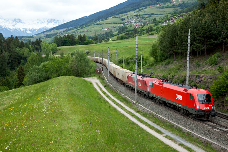 | In Tandem schleppten 1016 009 und 1216 011 diesen INTERMODAL-Containerzug nach Brennero. Matrei am Brenner, 17. Mai 2011 |