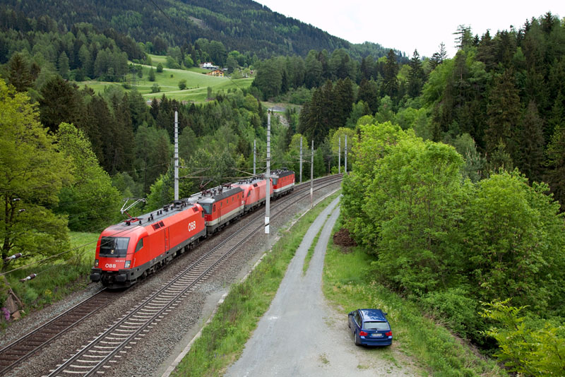 | Als Vierer-Lokzug rollten 1016 029, 1144 094, 1116 074 und 1144 263 talwärts. Matrei am Brenner, 17. Mai 2011 |