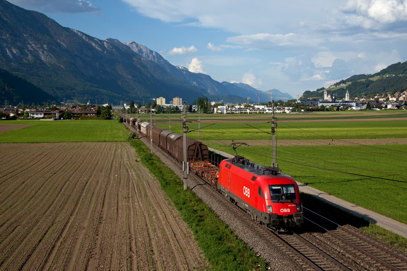 | Einen gemischten Güterzug nach Innsbruck hatte die 1016 026 am Haken. Vomp (Inntal), 19. Mai 2011 |