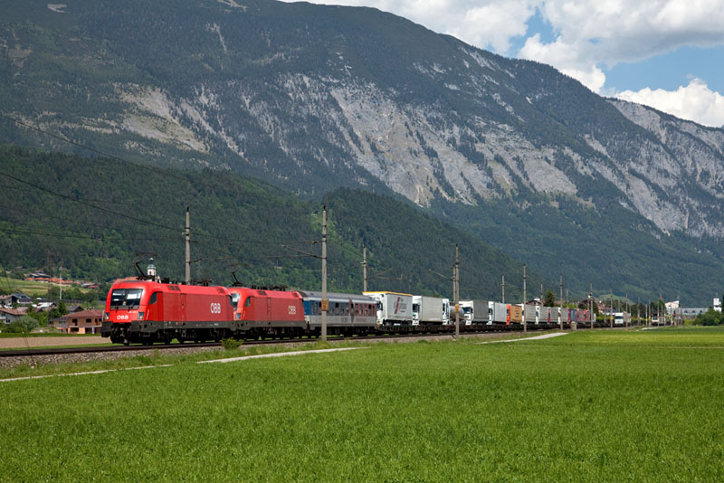 | Voll beladen war diese ÖKOMBI-RoLa nach Trento (Italien) mit 1016 032 und 1116 134. Vomp (Inntal), 19. Mai 2011 |