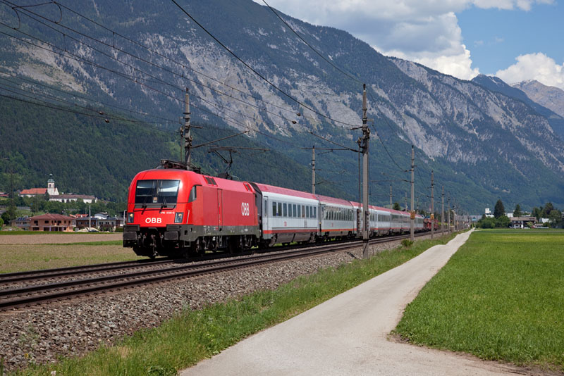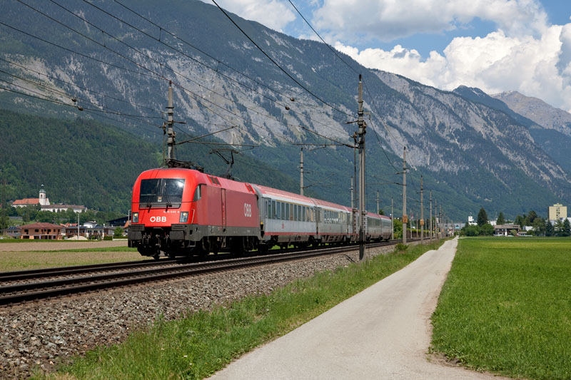 | Die blitzblanke 1016 011 mit dem OIC 864 nach Innsbruck. Vomp (Inntal), 19. Mai 2011 |