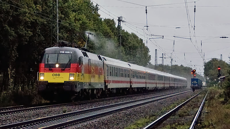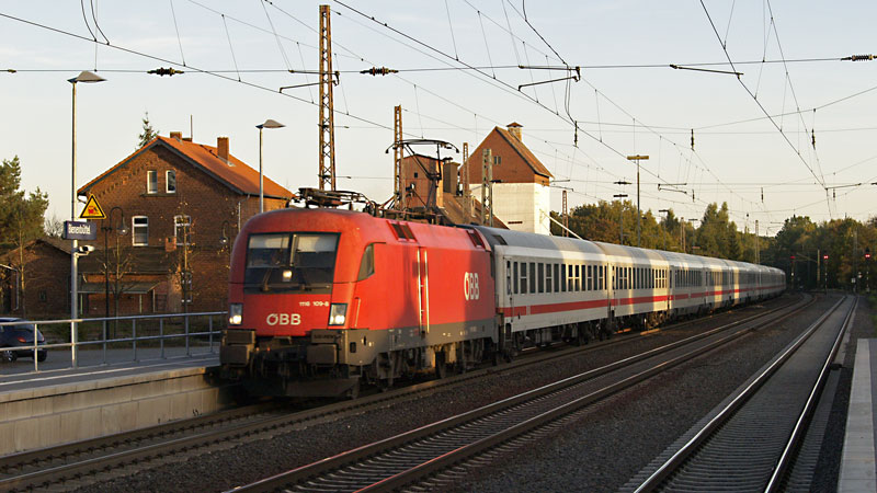 Diesen IC 2082 "Königssee" im Herbst abzulichten wird immer schwieriger – hier passierte dieser "Starzug" mit der 1116 109-8 der ÖBB den Bahnhof. Bienenbüttel, 13. Oktober 2007 | ||