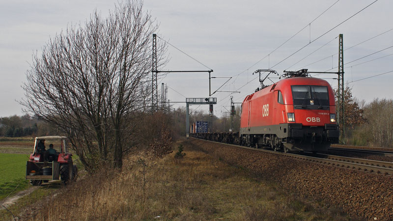 Als ein schon betagtes Bauernehepaar mit ihrem Trecker zu ihrem Feld fuhr, kam die ÖBB 1116 077-3 mit ihrem Containerzug gen Süden entgegen. Ashausen, 8. März 2008 | ||