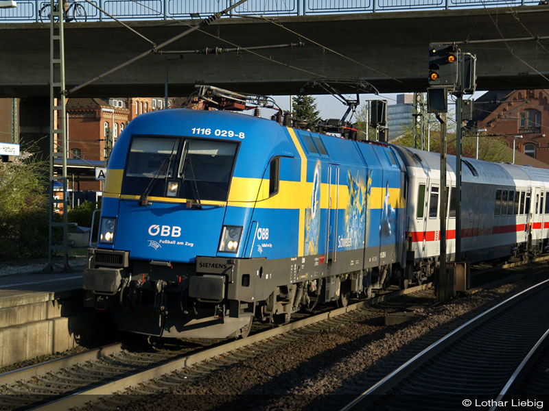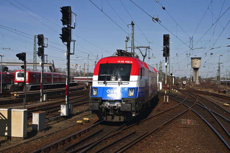 Schön, der EM-Botschafter der Österreichischen Bundesbahnen, die 1116 108-0 "Kroatien" mit dem UEx/CNL 13374 bei bestem Wetter! Hamburg Altona, 23. März 2008 | ||