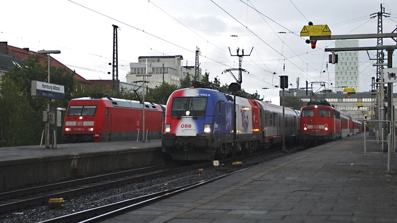 Showdown! Flankiert von einem IC mit der 101 099-0 und einem AZ mit der 115 383-2 fährt der "Franzose" aus. Hamburg Altona, 15. Juni 2008 | ||