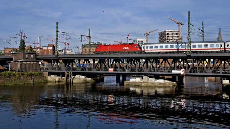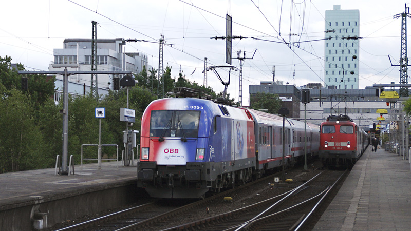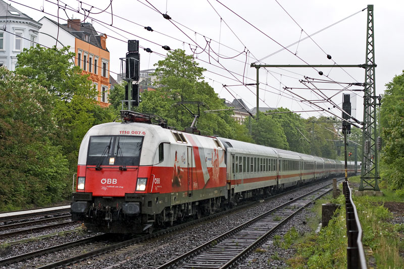 Die 1116 116-3 der ÖBB überholte mit ihrem IC 2082 "Königssee" einen Güterzug. Hamburg-Veddel, 25. Juni 2010 |