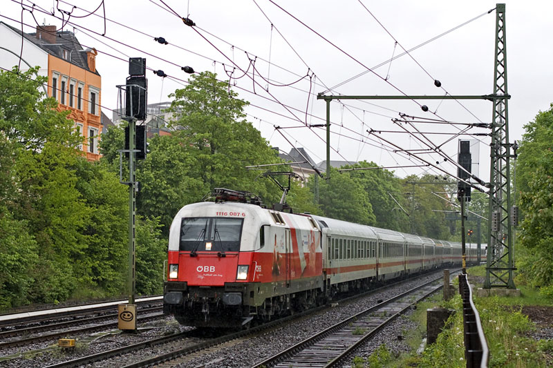 Mit dem IC 2082 Königssee kam nach langer Zeit wieder eine Werbelok der ÖBB nach Hamburg! Diesmal war der EM-Russe 1116 084-3 dran. Hamburg Sternschanze, 10. Juli 2008 | ||