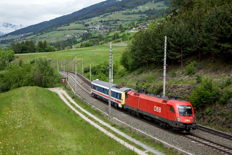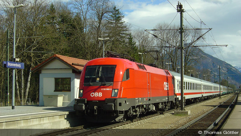 Mit einem EC aus Italien durchfährt die 1116 060-3 die Ortschaft Brannenburg in Deutschland auf der Korridorstrecke zwischen Kufstein und Rosenheim. 16. April 2006 | ||
