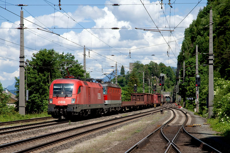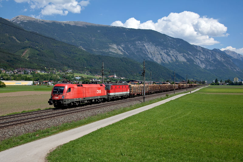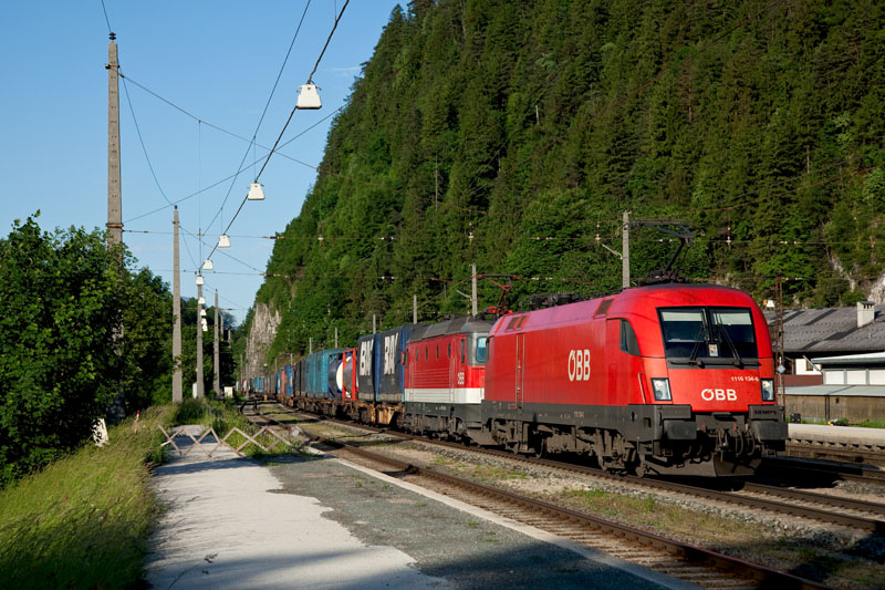1116 074 und 1144 202 vor einem gemischten Güterzug. Brixlegg, 18. Mai 2011 |