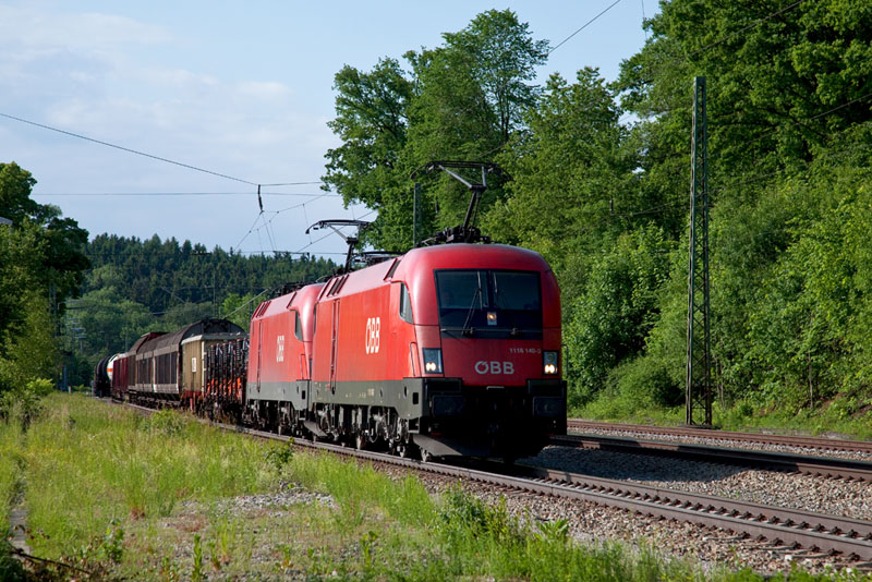 Mit einem gemischten Güterzug kamen die 1116 140 und 1116 114 nach München. Assling (Obb), 21. Mai 2011 |