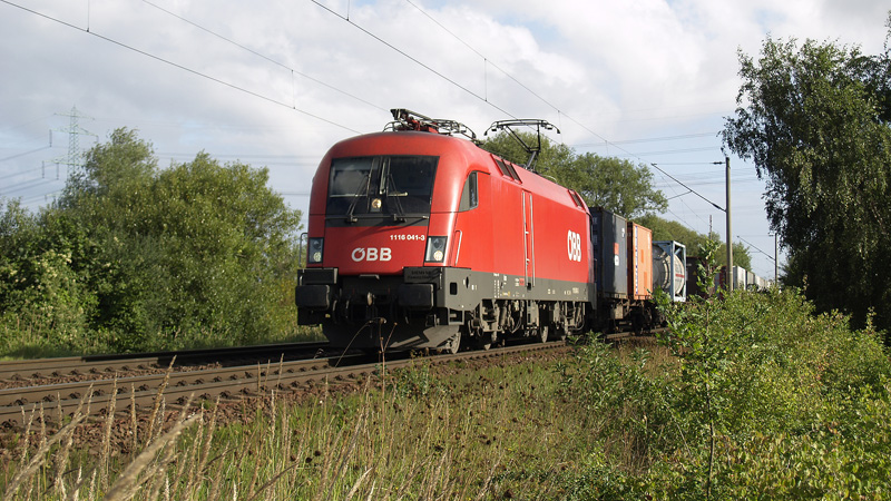 Was für ein Stier! Der ÖBB Taurus 1116 041-3 mit einem Containerzug in Hamburg-Moorburg, kommend von Hamburg-Waltershof auf dem Weg in den Süden. 31. August 2006 | ||